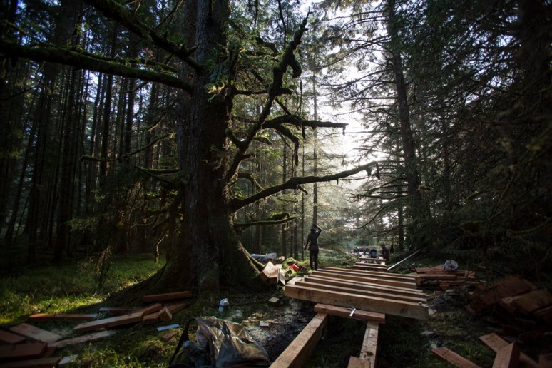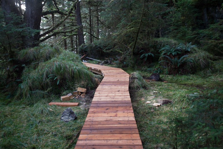 …like these ones used for the top surface of the boardwalks constructed at Sgang Gwaay in 2018. This photo was taken in November 2018 – the big tree to the left of the boardwalk in this picture is a Sitka spruce. A Hurricane brought this and many other trees down and destroyed much of the brand new boardwalk in December that year…(the story of the doll Sitka which I made from a piece of this tree can be seen if you click here).