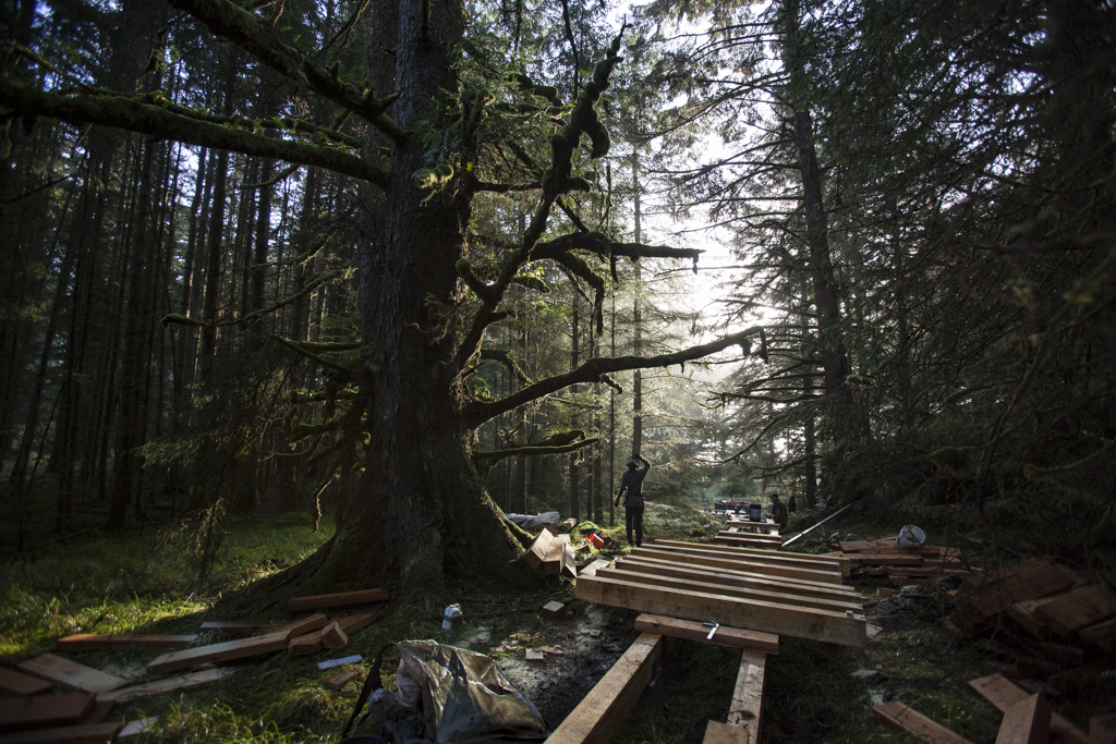 …like these ones used for the top surface of the boardwalks constructed at Sgang Gwaay in 2018. This photo was taken in November 2018 – the big tree to the left of the boardwalk in this picture is a Sitka spruce. A Hurricane brought this and many other trees down and destroyed much of the brand new boardwalk in December that year…(the story of the doll Sitka which I made from a piece of this tree can be seen if you click here).