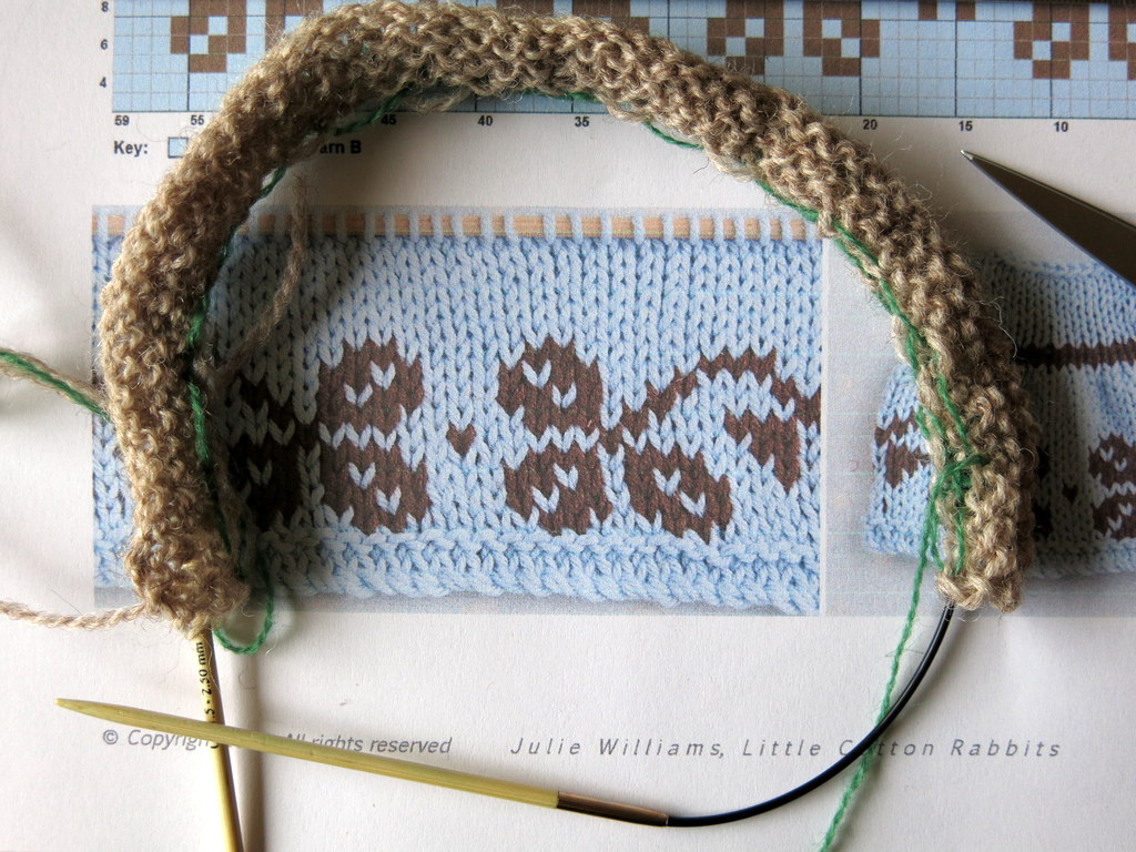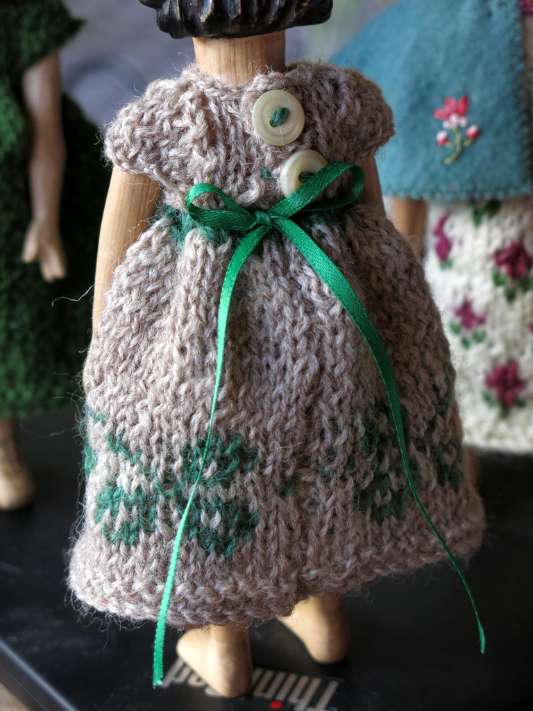I decided to try making some Hitty dresses in colourwork, which fortunately only requires very small balls of yarn.  I adapted some patterns from “Little Cotton Rabbits” (click here for the website). I thought this particular pattern (Autumn Leaves) looked a bit like shamrocks, so I knitted it in green and “oatmeal”.