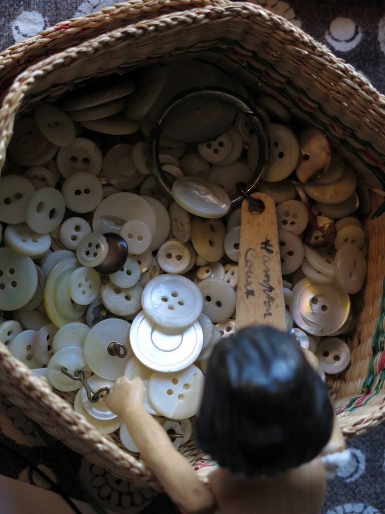 …selecting two similar mother-of-pearl buttons from the oddments in the button basket…