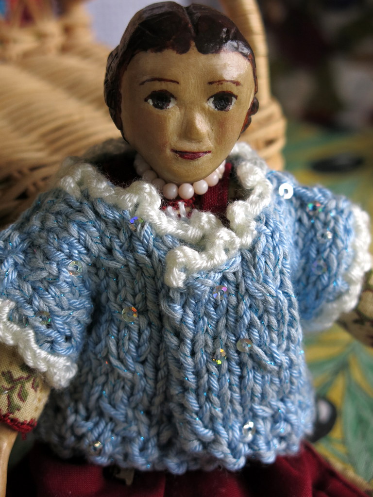 How wonderful to be given these lovely gifts – including this sweet little jacket, knitted by her friend! We love the blue colour, the fancy sparkles and the sweet crochet edging.