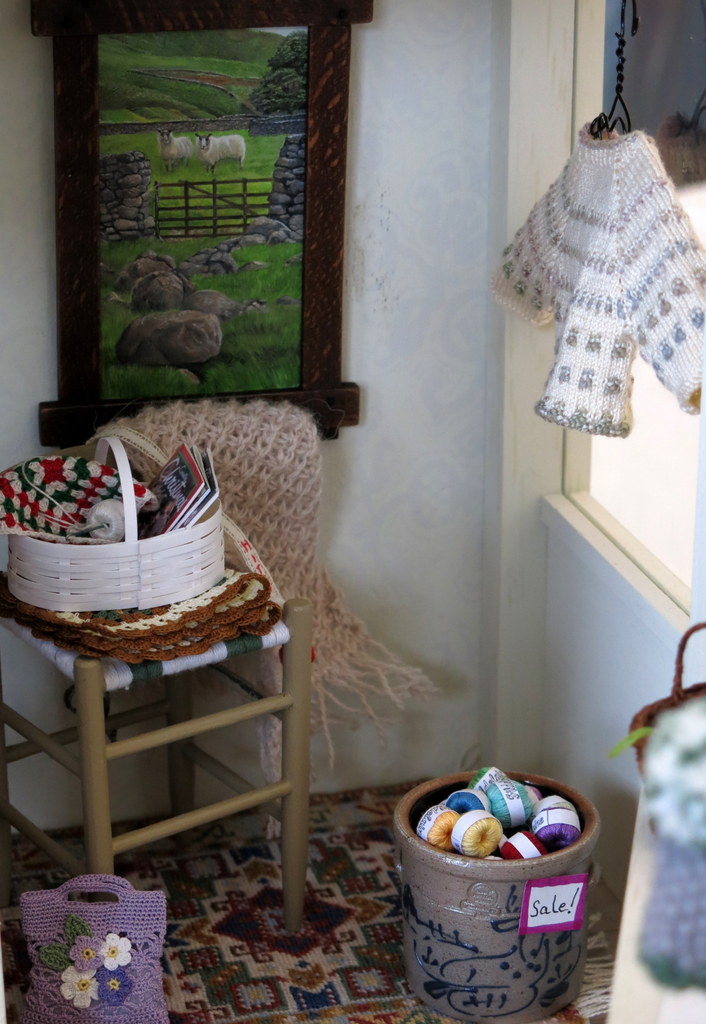 Look at all the lovely squishy yarns, the carpet, the crochet basket, magazines, shawl, woven-seat shop stool and the gorgeous little shopping bag! What a wonderful shop!