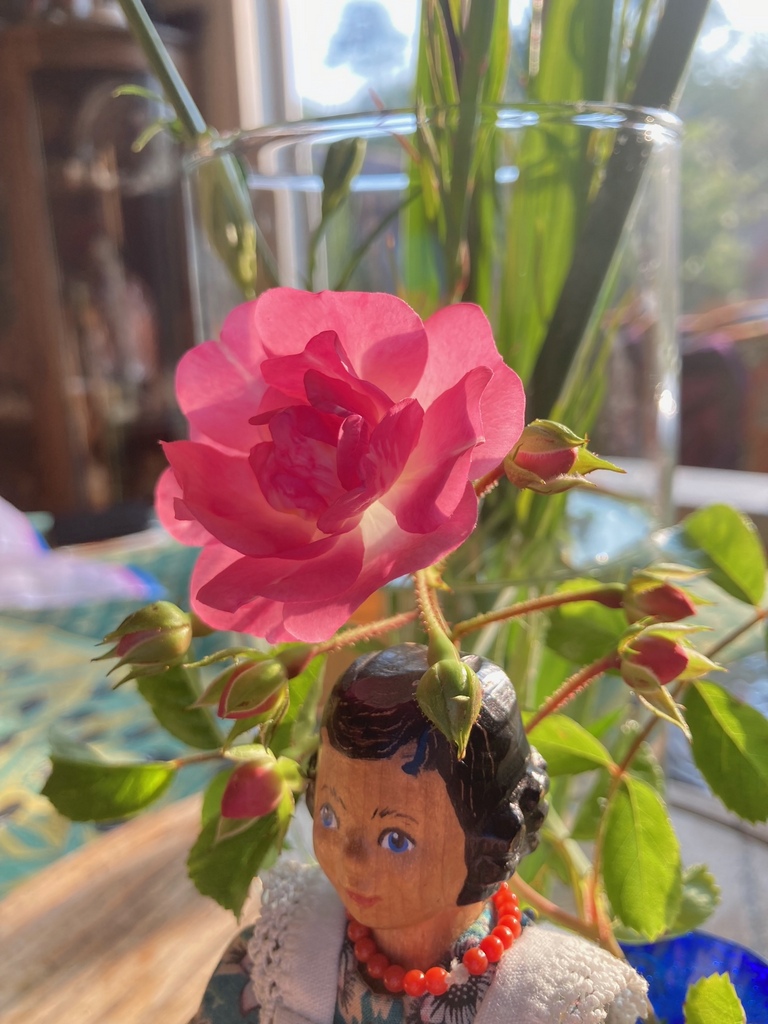 Rose is a dear little doll, she is happy that our neighbour’s roses are growing through the fence so we can enjoy them too!