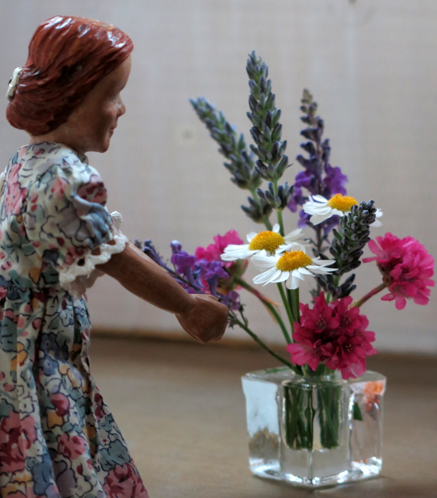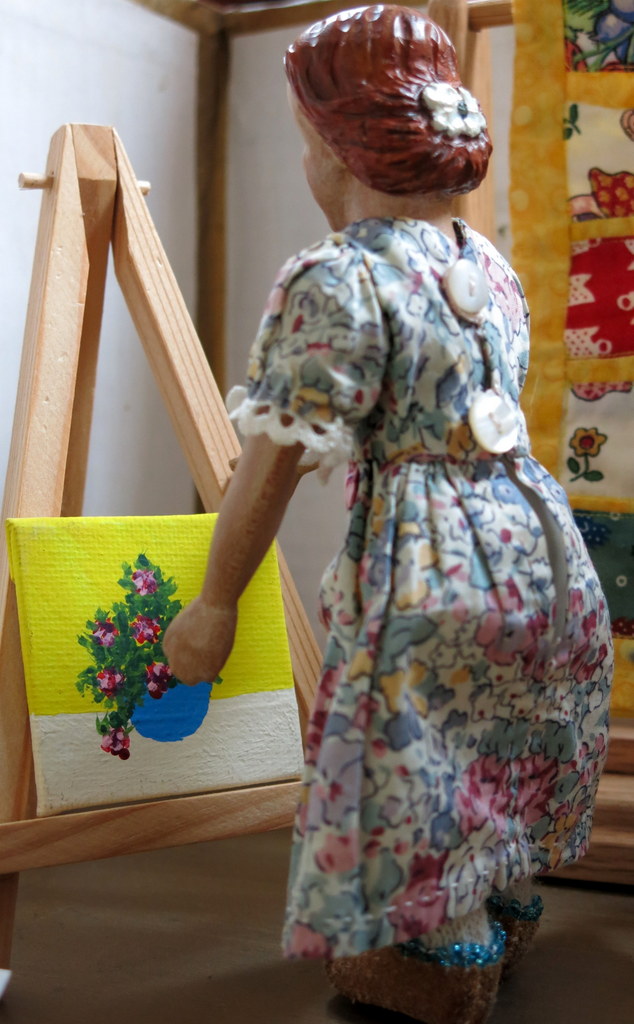 Floradora is busy changing the exhibit in the Hitty’s Art Gallery, with a cheerful summery quilt…