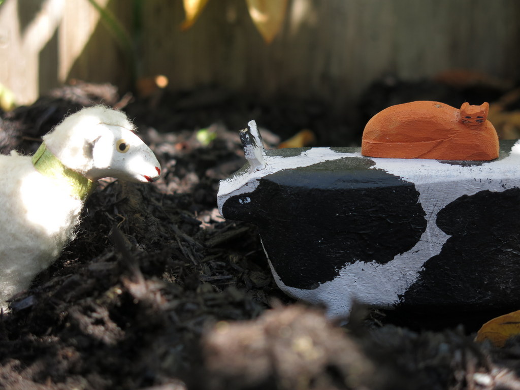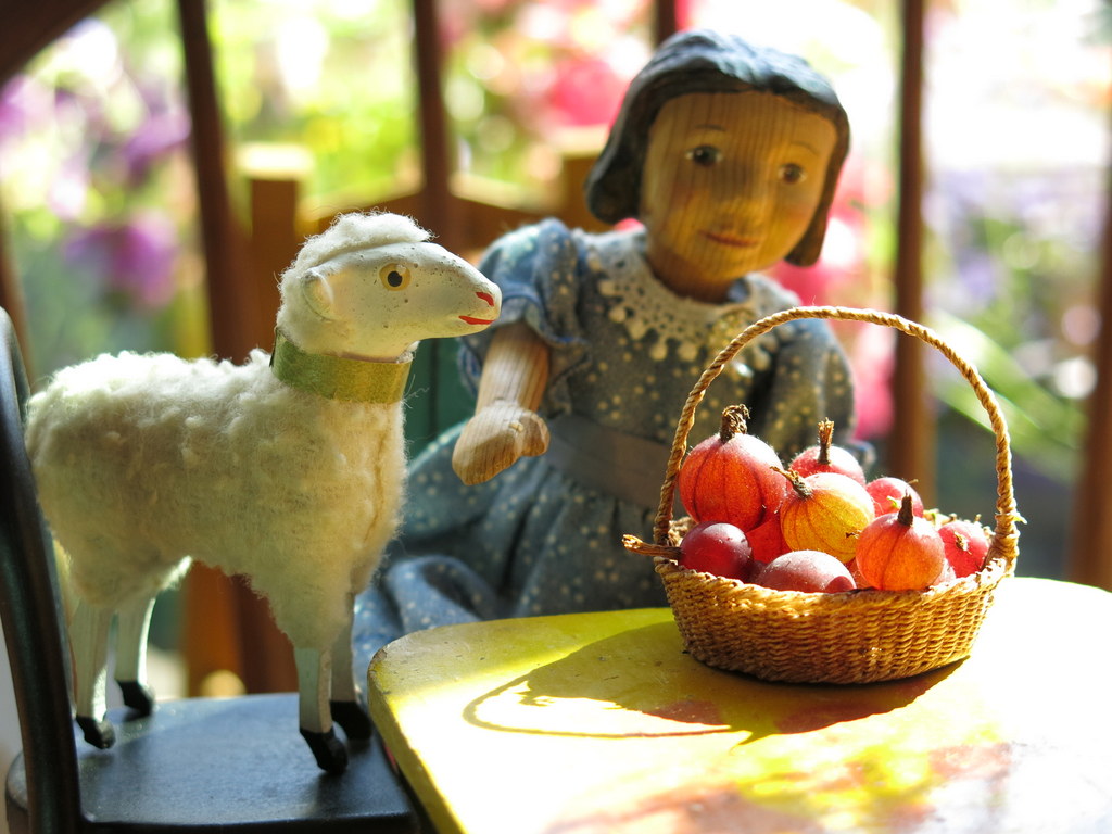 Thanks so much to a talented Hitty friend from France, who made the beautiful basket; the generous Hitty friend in Quebec who sent the basket, the little lamb, and the cat/cow to me; and to the youngest Human in the family for her photographic (photos 2, 5, 6, 8, 10, 11, 12, 13)  and editorial contributions!