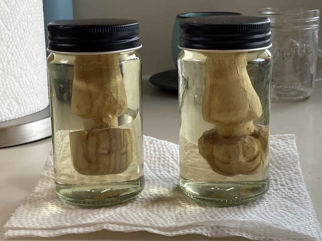 …so we soaked the Ash blanks in 50/50 Aviation Gin mixed with water. Alcohol softens up the exterior surface of the wood, making it much easier to carve. The white ash soaked up a lot, perhaps because of the porosity of the grain…
