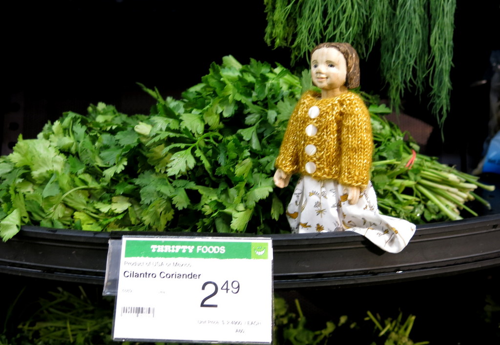All parts of the coriander plant are edible. The aromatic leaves, known as Cilantro in North America, are a familiar flavour in Mexican cooking. Some people describe the leaves as tasting and smelling lemony and refreshing, but others think the smell is foul and revolting. This depends on inherited genes. The Quimper Hitty human is one of the people who gag at the smell and taste of cilantro, so we don’t have it in the house or garden, though the Hittys don’t mind it and the little flower seems quite pretty!