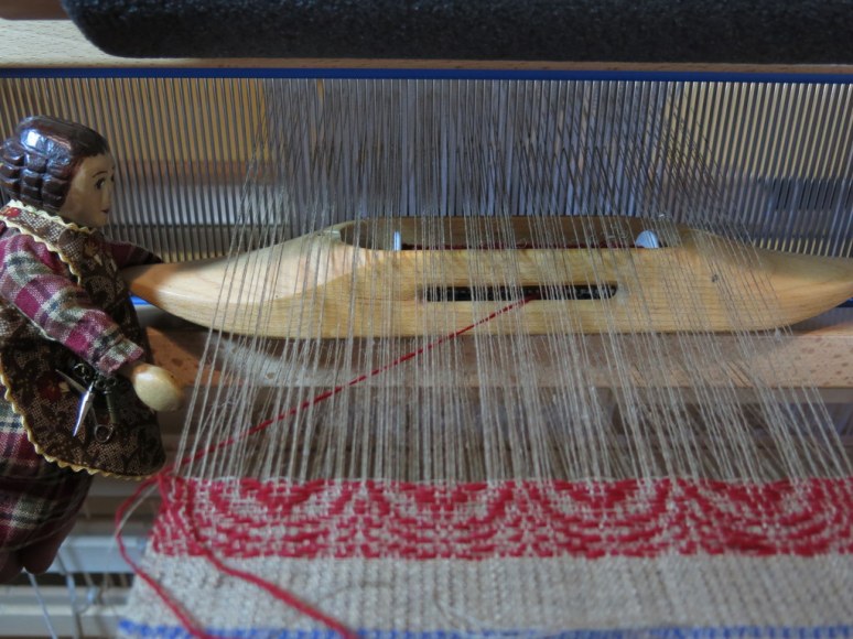 …and then a plain weave weft to bind it together using linen…(I can see a threading mistake in this picture, but luckily it doesn’t affect the pattern wefts!).