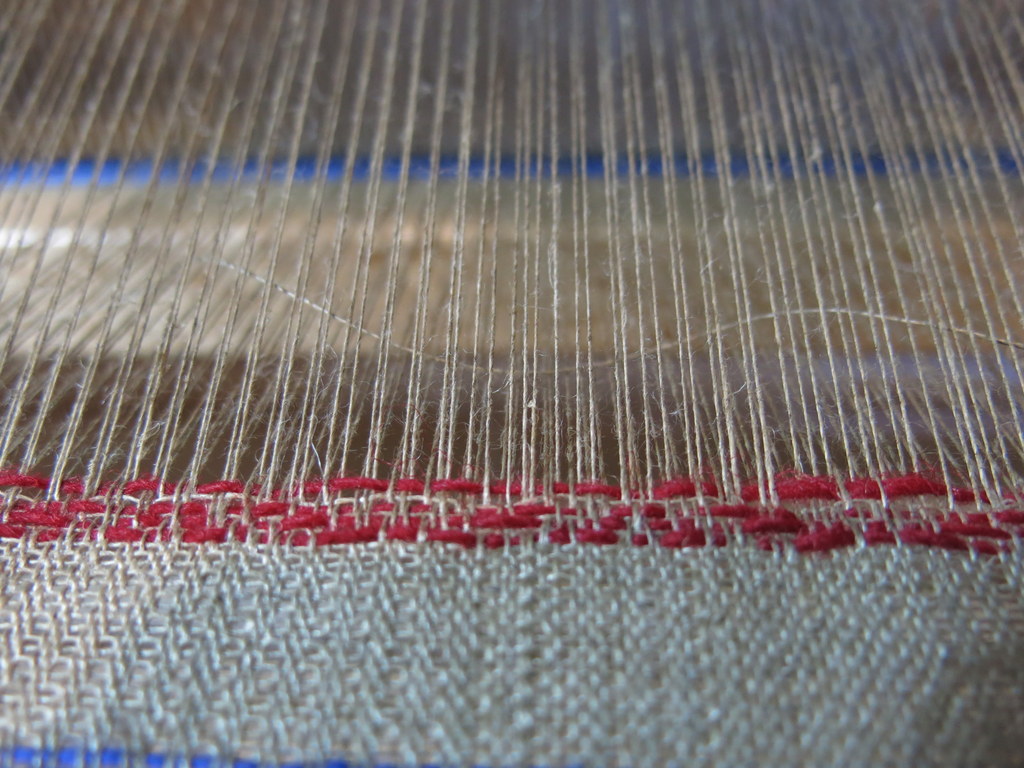 …and then a plain weave weft to bind it together using linen…(I can see a threading mistake in this picture, but luckily it doesn’t affect the pattern wefts!).