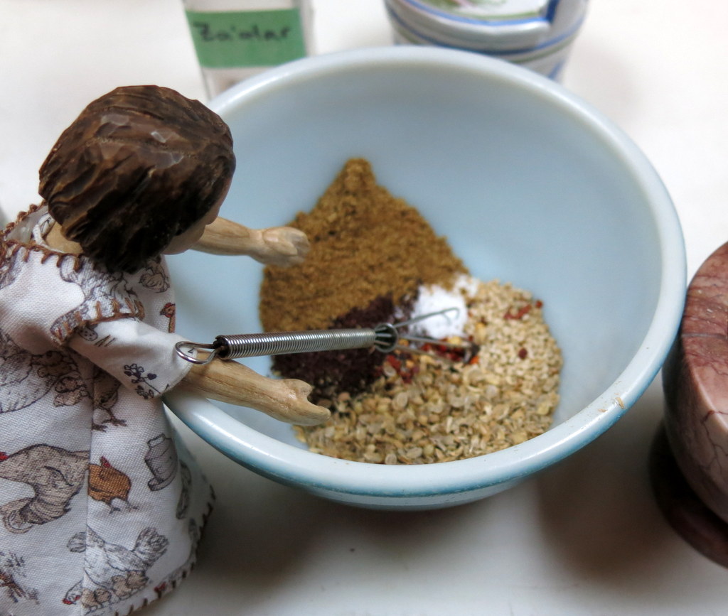 We used a recipe from the internet – you may find many variations as the mixture varies from country to country. Most have thyme, sumac, salt, sesame seeds, coriander and cumin, sometimes chili, or oregano. This mixture is perfect for sprinkling onto soup or hummus, or adding flavouring anything that needs a little savour of the middle east!