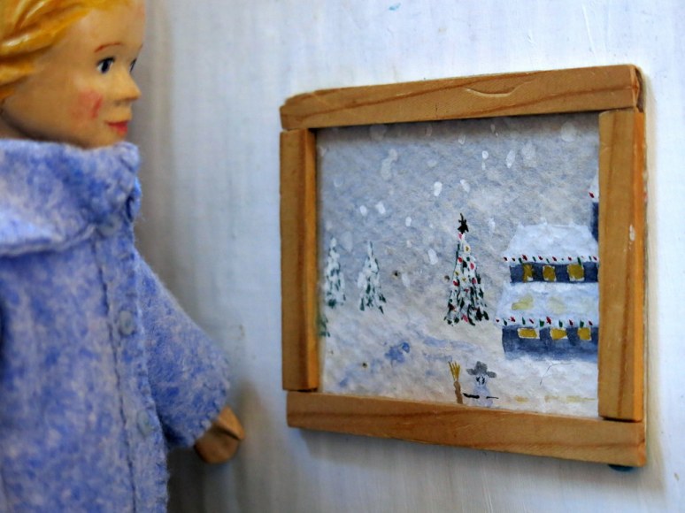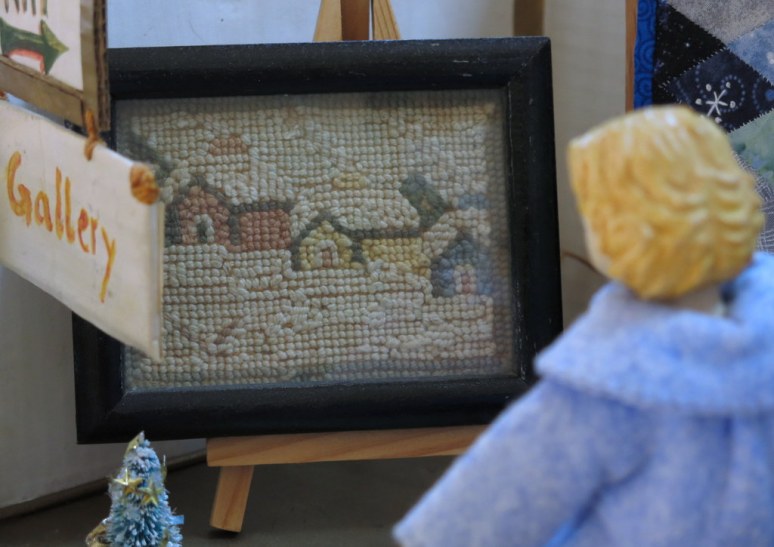 …to see the winter art offerings – like the tiny framed hooked rug (rescued from a Charity Shop)…