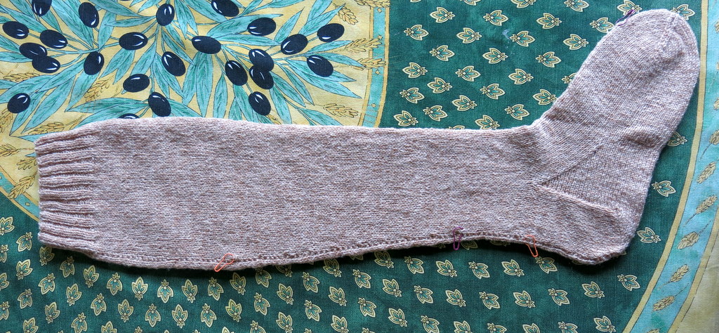 …and here is the result…It is a very shapely stocking withal. When I started knitting it, I thought it would fit a very wide and very long leg, but of course I was used to knitting ankle-length socks. These would go up over the knee and be held up with garters!