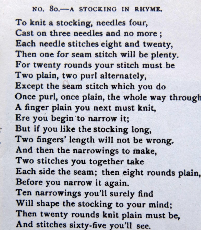Using the same yarn, I tried my hand at knitting a “stocking in rhyme” from the Jennie June Series of Manuals for Ladies  – Knitting and Crochet – a guide to the use of the needle and the hook (1885)…