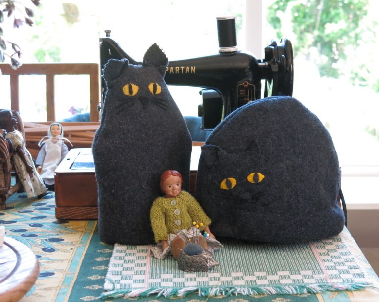 Love it all – the matching cosies will keep an eye on you while working in the kitchen. The sewing machine looks almost the same as my old Singer. And I recognize the Cathi Jefferson tea pot. Are you going out to Fired Up?