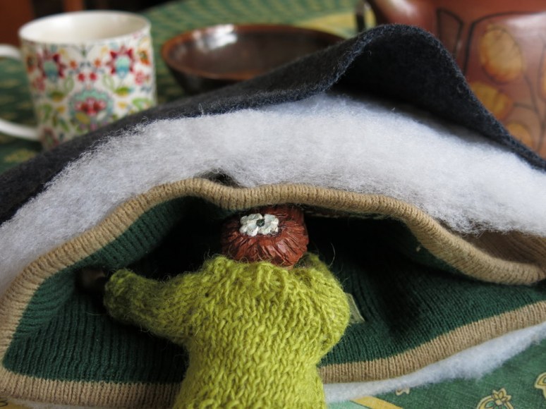 …and layered with the old felted wool shirt scraps on the outside, the batting in the middle and the random touque on the inside…