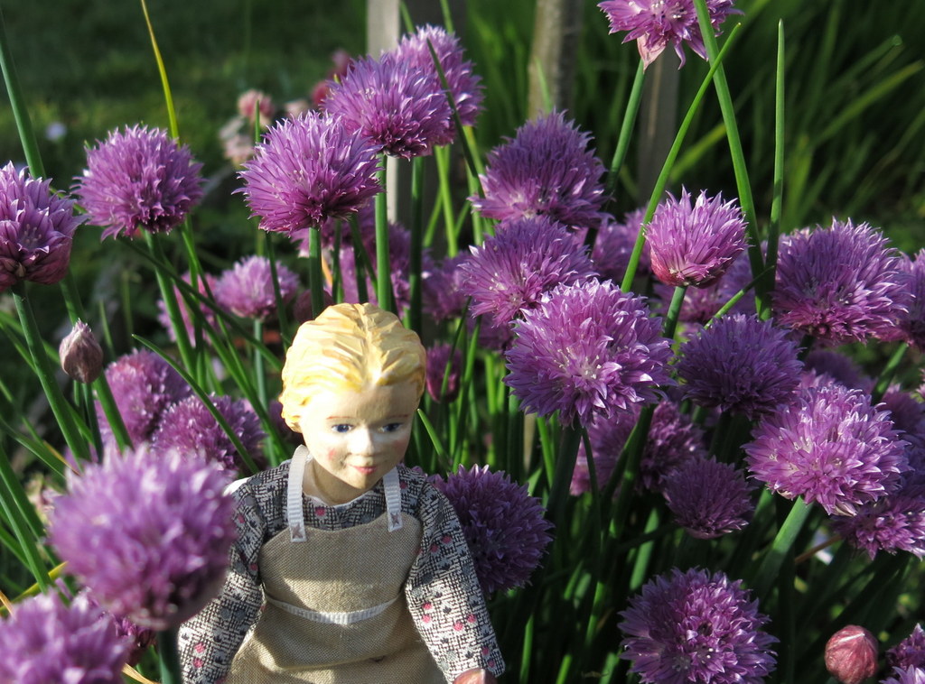 Awww thanks, Henrietta is blushing, a bright pink-cheeked glow. She admires the onions too, and doesn’t mind the Hitty cupboard smelling like chives, both raw in the bouquet, and in purple soup form in Jane’s kitchen!