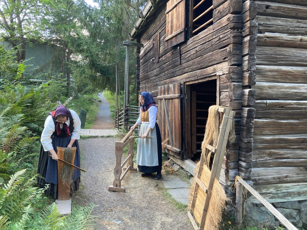 • I am glad you felt like coming along with us! The lady was twisting the bast fibre using that little wooden device that looks a bit like a small swift. It was intriguing! The end of a process of preparing the inner bark. It looked labour intensive, like so many of the processes in those days.