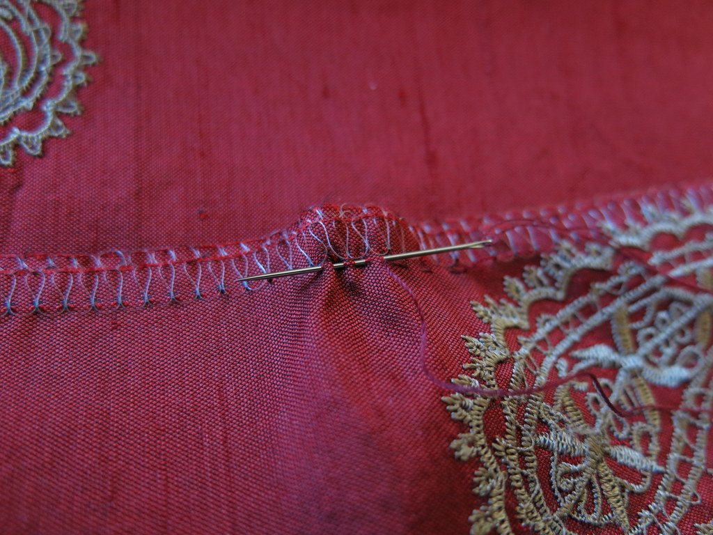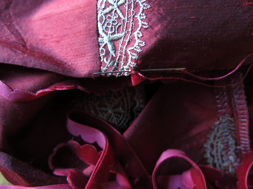 Indeed it’s so true that the underthings only go so far in modesty and fashion. Eve was very happy with the choice of silk and the rich red colour. There isn’t any more of it though, I used the entire square to make the petticoat so we shall see what turns up for the jacket. Yes the silk was pretty tricky – I left the edging in place when I sewed the petticoat, the raw silk was very prone to fraying!