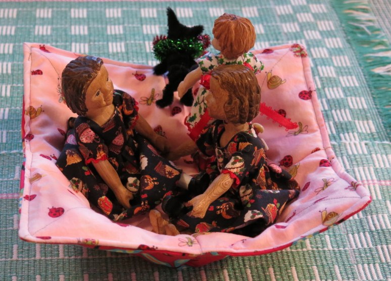 …while Coriander, Cooky, Arianell and the Christmas Kitty pretended to sail off in the new bowl cosy – Crafty Advent Calendar gift#10…