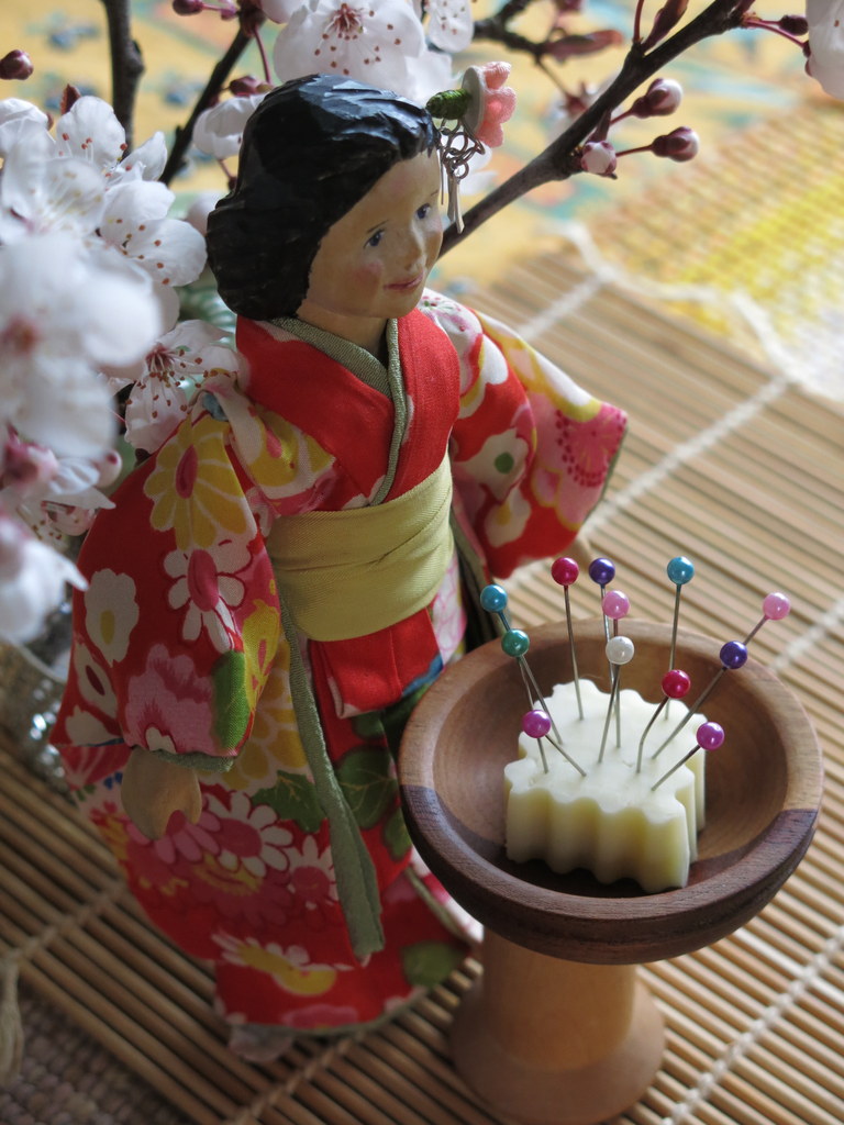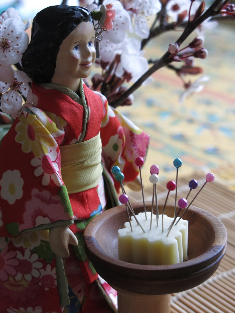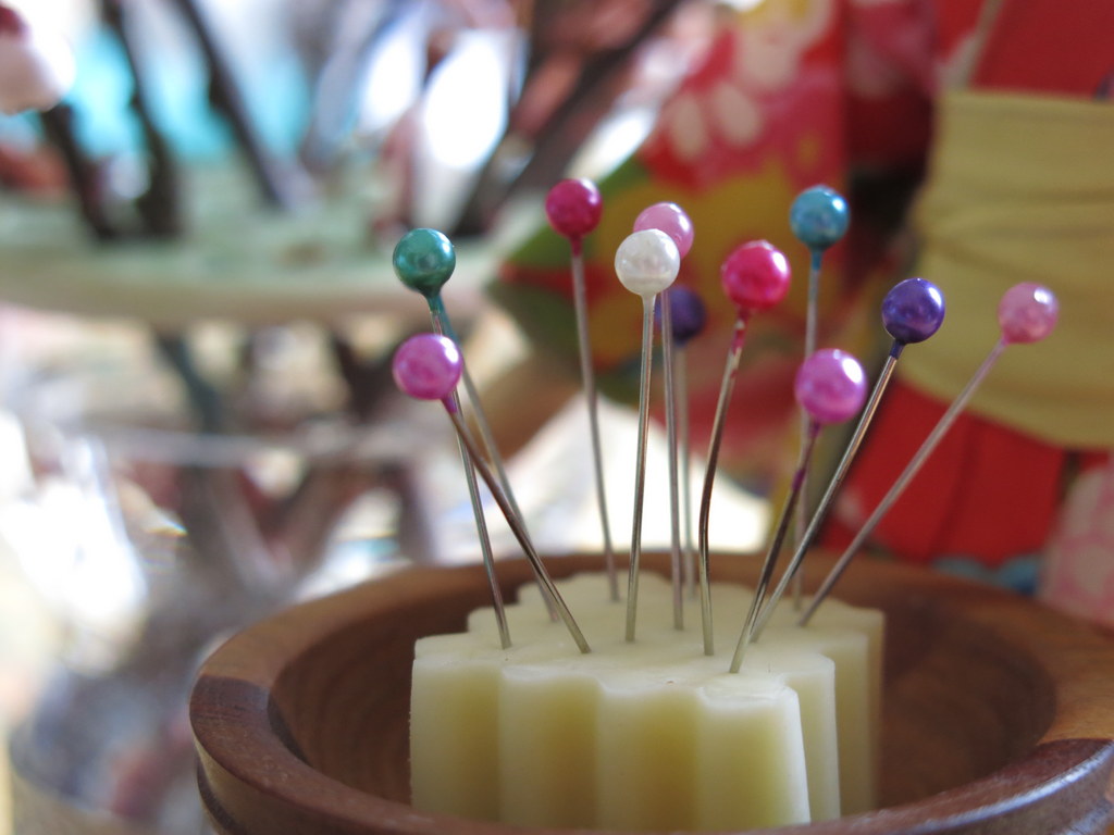 After a year of pinning and sewing into multiple layers of fabric, the tired pins are gently pushed into soft tofu…