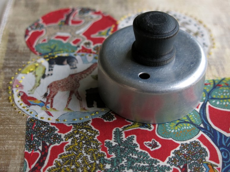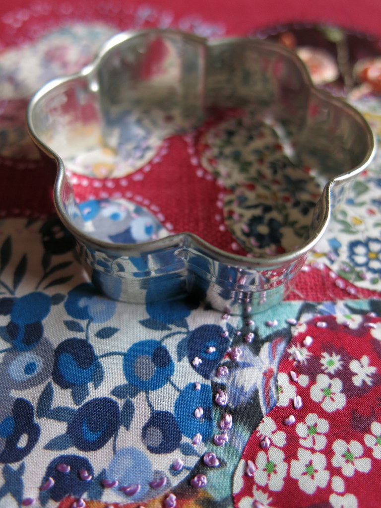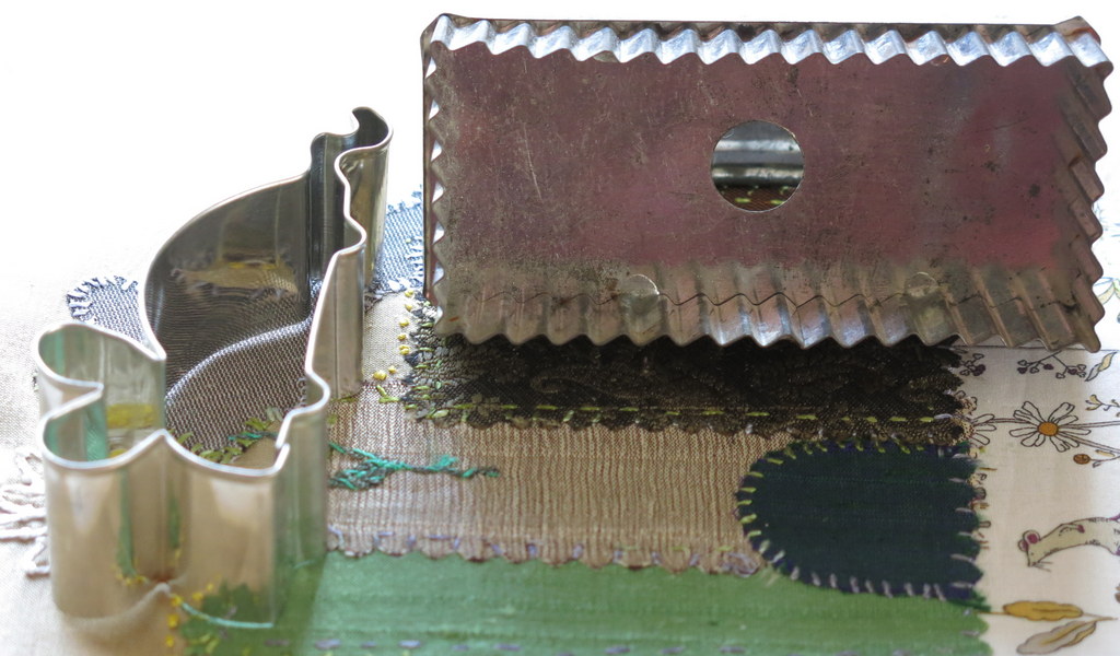 I have been working on a stitched book project since January.  Working for 15 minutes a day, and for a total of five days per page, I will end up with a 20 page sewn book.  All the fabrics and the sewing threads used in my book are scraps.  I am using cooky cutter silhouettes on each page. On page thirteen, my lovely old biscuit cutter made…