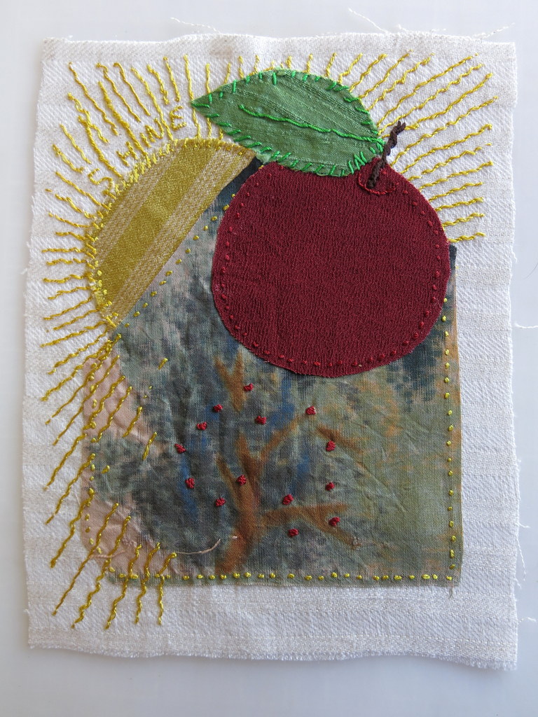 …apples and sunshine! There are a couple of pink sewing threads in the silk background fabric lower left.  They won’t be removed because they are original sewing threads from when it was a kimono.