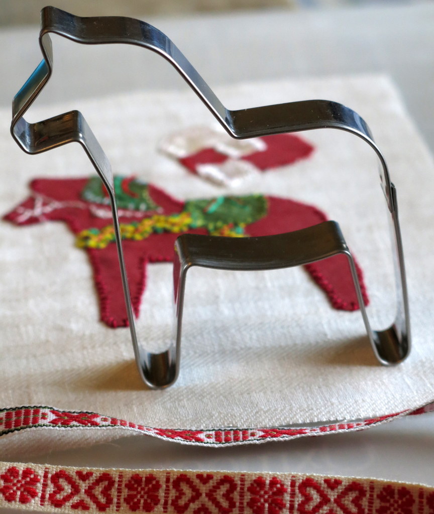 …I made a Swedish Dalahäst from one of my favourite cooky cutters, and a couple of scraps of Swedish braid.