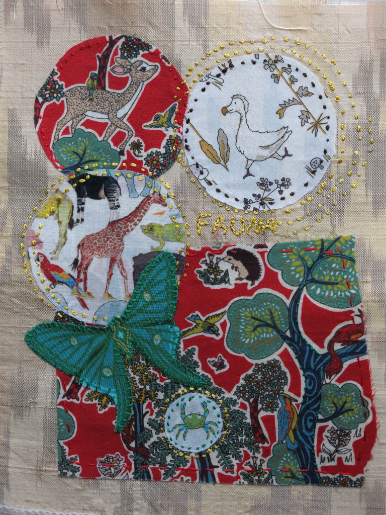 …to make a little faunal abstract. I actually have one more day of sewing to do on this page, I think I will add backstitched dots around the butterfly and the red circle with the fawn in it.