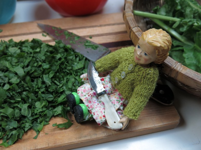 Then chopped all the greens with a big knife…