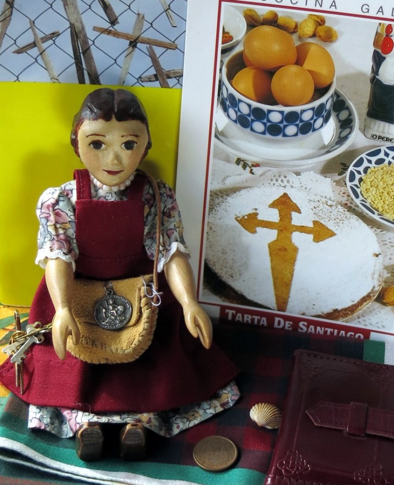 We walked the Camino de Santiago ten years ago, but Constance has a few recuerdos as well as memories…here she is sitting on the very hanky that she shared my pocket with, and surrounded by other mementos…