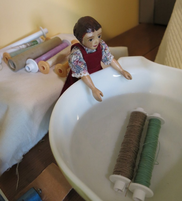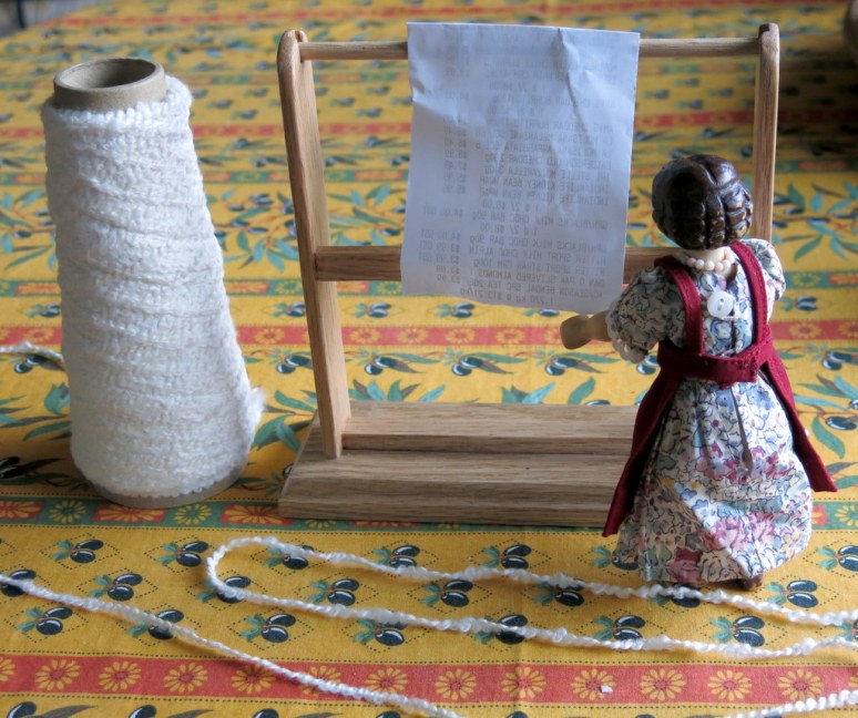 She wrapped a piece of paper around the bars to see if she could use the rack to make a towel-shaped weaving…