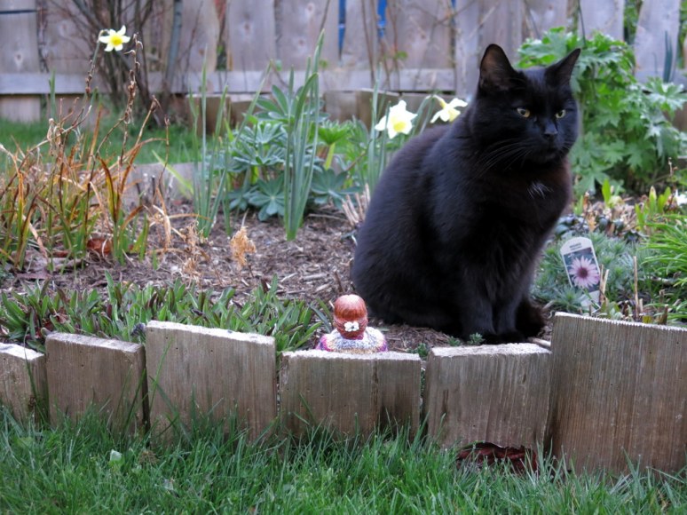 Floradora is glad of her knitted dress and thick sweater…there was frost on the ground this morning! Siyah doesn’t much mind, as she still has her winter coat!