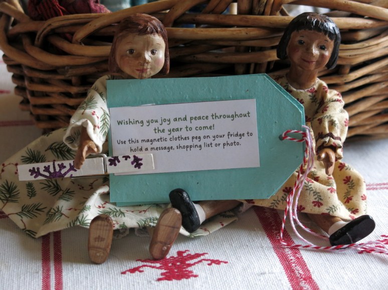 Graziella and Abigail opened the Crafty Advent Calendar on December 14 and found a pretty magnteized clothes pin, and a couple of handmade paper gift tags – what fun!